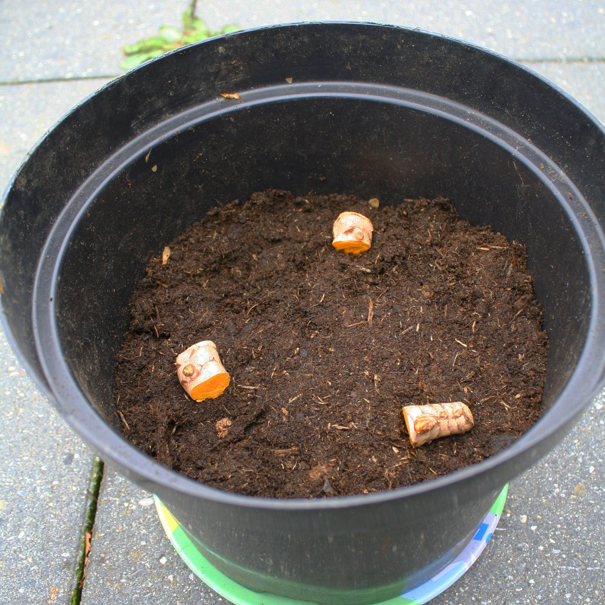 De stukjes leg ik, met de ogen omhoog, in een ruime pot met gaatjes onderin. Hoewel deze wortels van een klamme warme plek houden, wil ik geen schimmel in de pot. Het vocht moet kunnen weglopen.