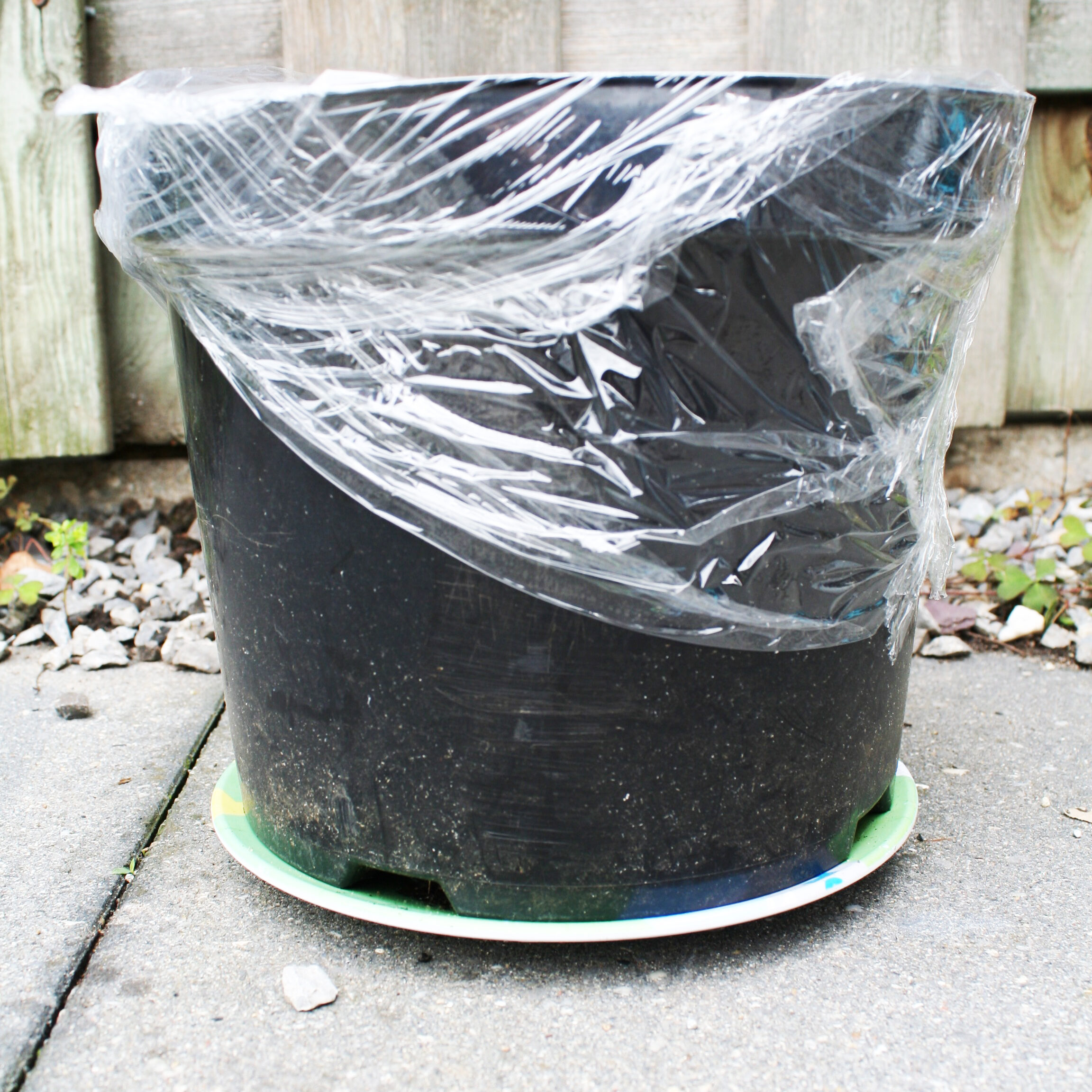 De pot dek ik af met een doorschijnend plastic. Hierdoor blijft er veel vocht in de pot en kan het warmte behouden. Hiervoor is het dus ook belangrijk er niet teveel water in te doen, het is op dit moment een klein kasje.